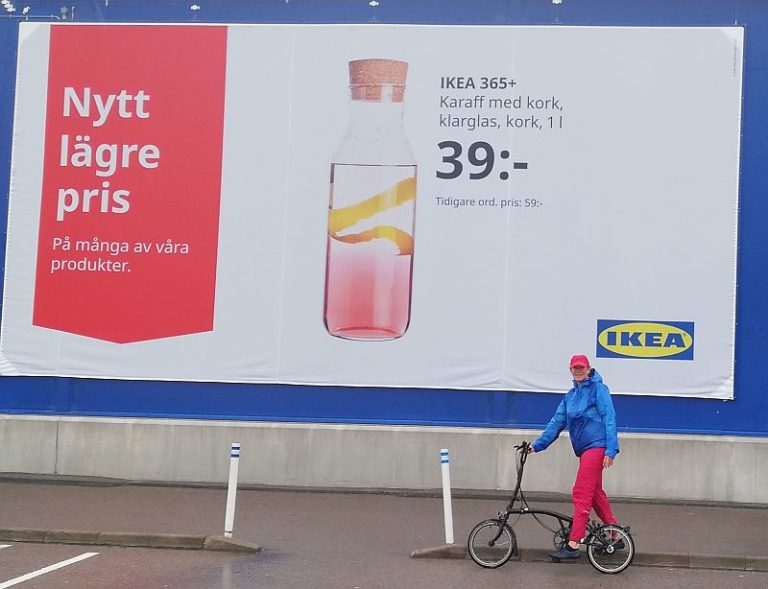 Hier ist eine kleine Wetterstörung seit Mittag eingetreten. Es regnet durch bis in den späten Nachmittag hinein. Als Münsteraner sind wir bestens vorbereitet. Regenjacke und -hose sind dabei und so radeln wir bis zum IKEA. Einfach, um es mal im Herkunftsland gesehen zu haben und irgendetwas gibt es bestimmt. Stabile Gläser finden den Weg in die Einkaufstasche.