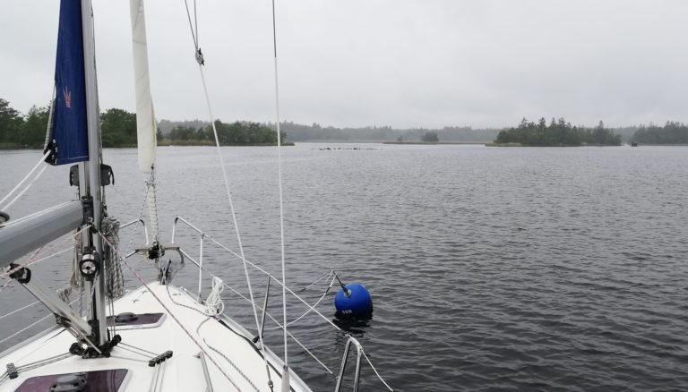 Am Dienstag verlassen wir Kalmar kurz nach 11 Uhr. Fahren noch eben zur Tankstation und füllen Diesel nach. Noch bevor wir die Ölandbrücke erreichen (verbindet Festland Schweden mit Öland und ist 6km lang, an der Durchfahrtstelle 36m hoch) wird es diesig. Nieselregen setzt ein und die Sicht ist stark reduziert. Wir fahren unter Maschine und schalten die Navigationslichter ein. Die Fahrwassertonnen lassen sich soeben noch erkennen. Der Himmel klart auf. Nach 2 Std. haben wir die Fahrwasseransteuerung zu unserem Ziel Pataholm erreicht. Jetzt sind wir wieder im Schärenfahrwasser und orientieren uns von Tonne zu Tonne. Das Ziel ist eine SXK-Boje und die ist diesesmal frei! Schön gelegen und umgeben von kleinen bewaldeten Inseln. Unser in Kalmar neu erworbener Bojenhaken kommt erstmalig zum Einsatz.